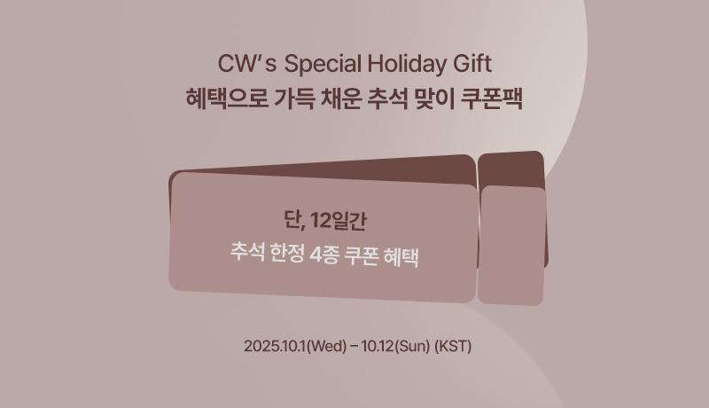 CW 글로벌 딜러 신청 안내딜러 혜택 및 신청 방법 등 안내CW 도매 회원 안내혜택, 신청 방법, 자격, 배송 안내[종료] 추석 한정 쿠폰 혜택향료 5%할인부터 무료 배송까지 혜택으로 가득 채운 풍성한 쿠폰팩[종료][CW위크] 전 상품 할인 쿠폰단 2주만 누릴 수 있는 최대 8만원 할인 찬스![종료][CW위크] 위클리 릴레이 특가최대 50% 세일, 5주간 매주 달라지는 릴레이 특가CW 시그니처 프래그런스 '여름밤'여름밤의 고요함과 낭만, 서정적인 분위기를 담은 CW만의 특별한 여름 향기[종료] 디퓨저 카테고리 전용 쿠폰 이벤트디퓨저 제작 모든 아이템, 최대 5만원 할인 혜택[종료] 포토 리뷰 이벤트CW 신규 조향 베이스 출시 기념, 리뷰 혜택 이벤트[종료] 새봄 맞이 첫 구매 혜택 이벤트설레는 첫 구매를 위한 5,000원 할인쿠폰[종료] 1월 구매 금액별 사은품 이벤트행복한 새해를 응원하는 CW의 특별한 선물